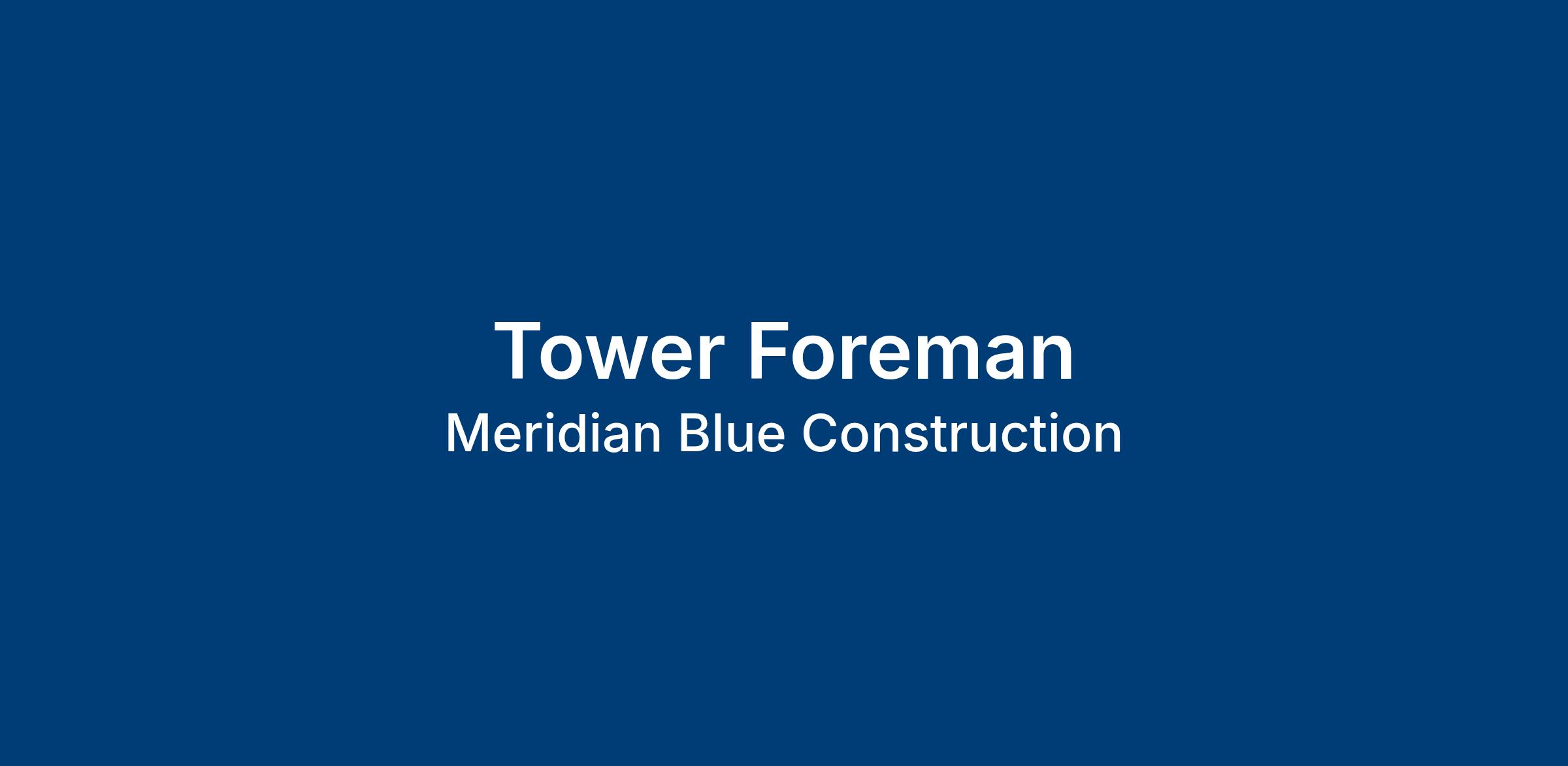 Meridian Blue is seeking safety-conscious, hardworking, and dependable individuals who want to advance their careers in the wireless telecommunications industry. Tower Foremen are responsible for leading a crew in daily operations to safely construct, install, and maintain communication towers and support structures and are a vital part of Meridian Blue. Eligible applicants will have at least 4 years of industry experience and two years of foreman experience.